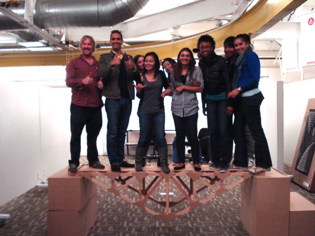 I HAD TAUGHT A COURSE AT SCI-ARC CALLED NATURAL STRUCTURES, WHICH I INTRODUCED IN THE FALL OF 2010 TO AUGMENT STRUCTURAL CLASSES. THE FIRST PROJECT IN SEPTEMBER WAS A TRUSS. THE MINIMUM AMOUNT OF MATERIAL TO BUILD THE MAXIMUM AMOUNT OF STRENGTH WITH A 8′ SPAN AND CARRY THE WEIGHT OF THE DESIGN TEAM. THE STUDENTS DESIGNED AND BUILT ONE, IIT CREAKED AND THEY REINFORCED IT, ALL ABOUT THE LEARNING PROCESS.